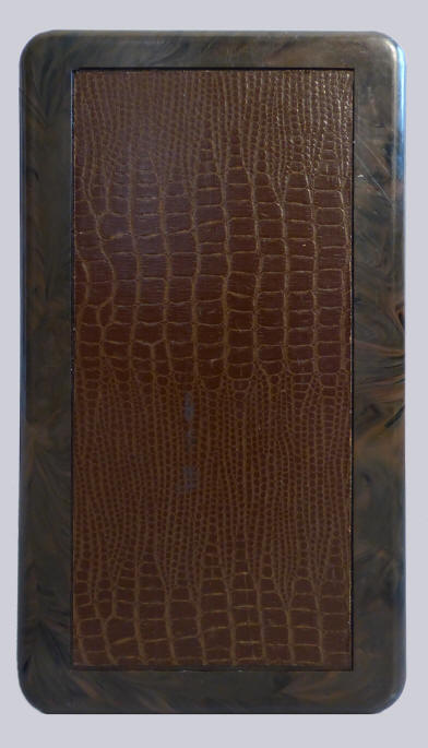 met bruine imitatie slangenhuid. Het front en de achterkant zijn van bruin gemarmerd plastic. De