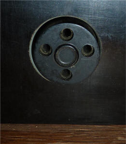 met twee venstertjes met messing beslag en rood glas. Er