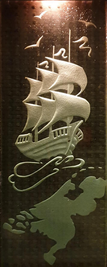 panels, on the left an old sailing ship and a map of